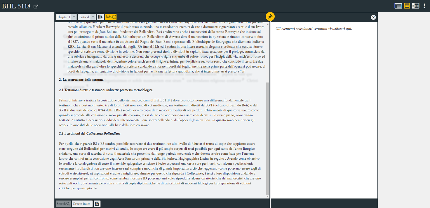 La barra interattiva sottostante permetterà inoltre tutta una serie di altre funzioni tra le quali: ottenere informazioni e contenuto dei manoscritti che riportano il testo, leggere la parte introduttiva che aveva trovato posto nel front del file TEI (immagine 4), esplorare indici e paratesto e passare velocemente da una sezione all’altra del testo.