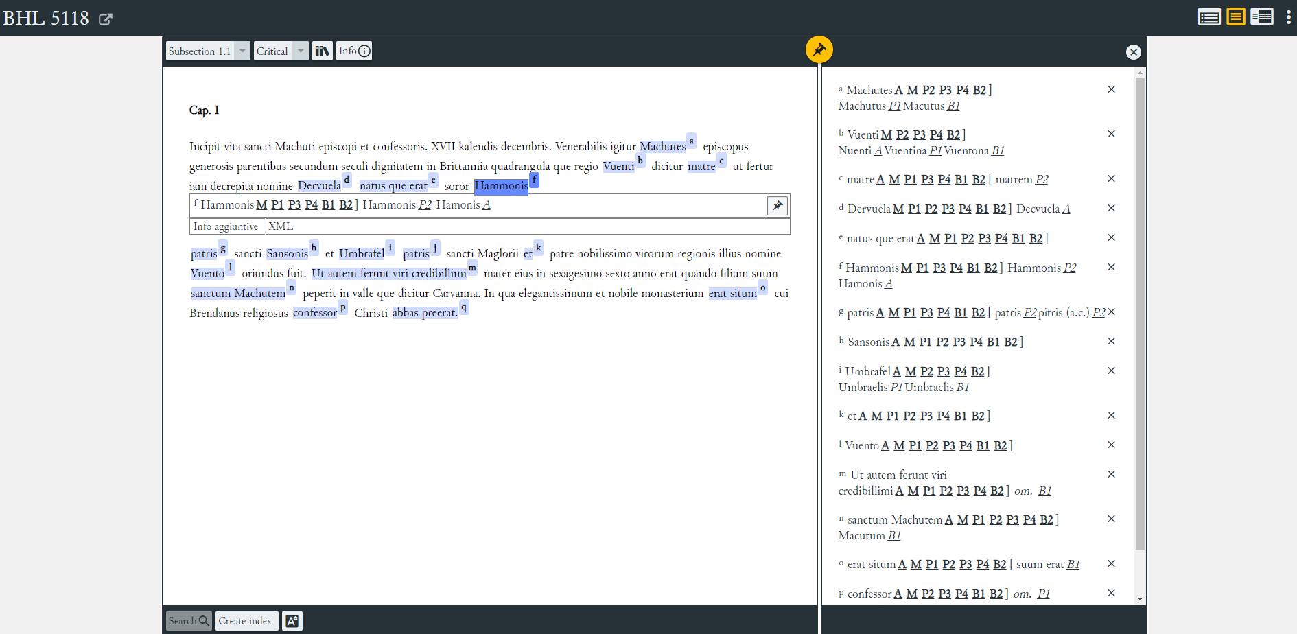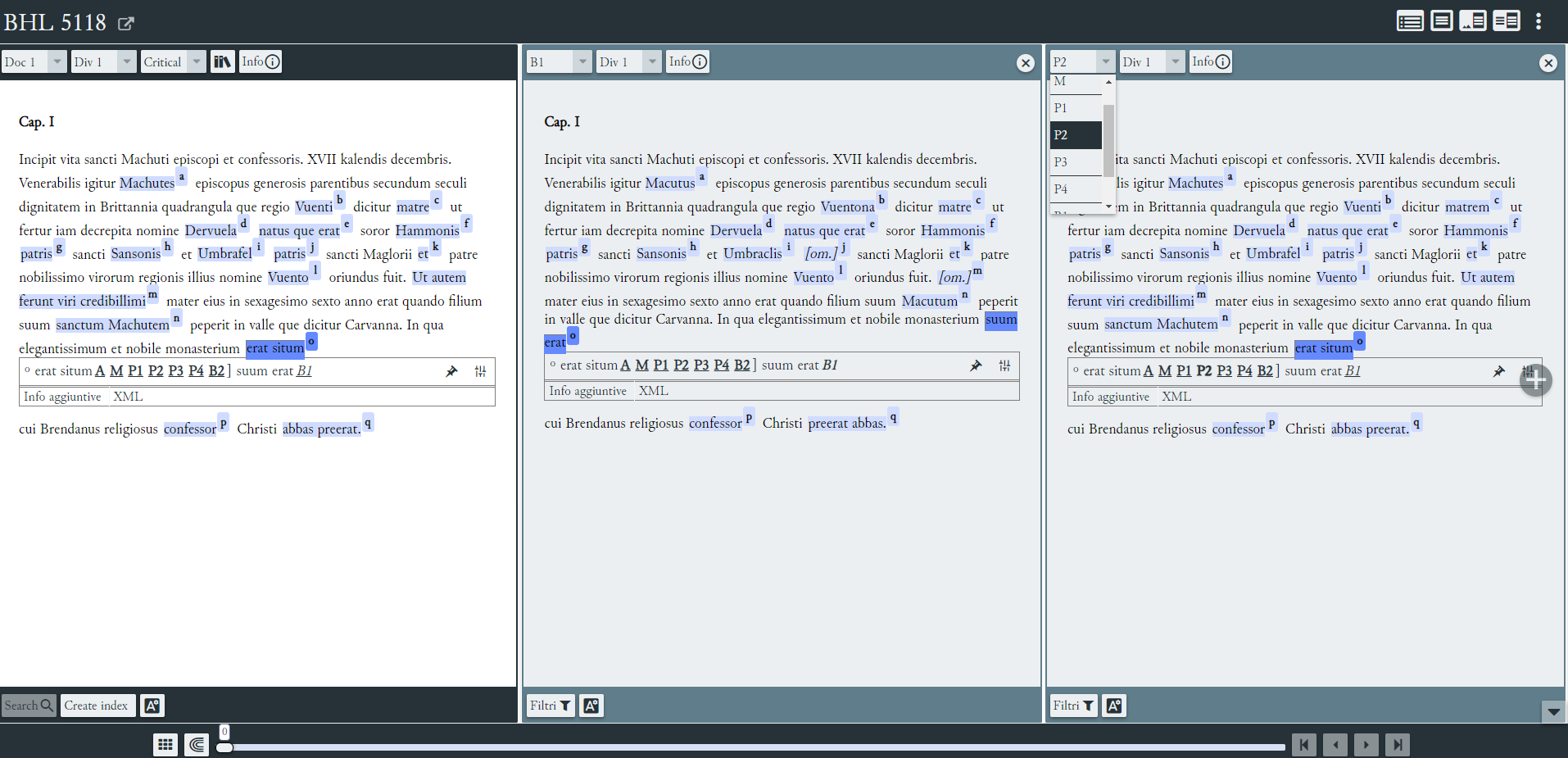 La poca flessibilità di EVT di cui sopra non permette la realizzazione dell’ultimo degli scopi che la parte digitale del lavoro vorrebbe avere, ossia la possibilità di istituire un confronto, non tra manoscritti del medesimo testo, ma tra il testo critico delle diverse parti del dossier, cosa che rappresenterebbe un passaggio fondamentale per mostrare in modo sinottico le differenze e le identità tra i vari prodotti agiografici e rendere evidenti i cambiamenti apportati e le motivazioni politiche e religiose alla loro base. Non potendo, come si è detto, modificare il codice di EVT, questa funzione verrà realizzata a parte, se i tempi lo permetteranno, creando un “confrontatore” tramite il framework Angular: l’idea è di sviluppare uno strumento molto agile che, sfruttando la composizione in episodi che presentano tutte le opere incluse nel dossier, permetta di selezionarne uno da un menù e mostrare i testi che lo riportano uno accanto all’altro, evidenziando le parti uguali e le differenze, tra uno o più testi a scelta dell’utente. Questo strumento di confronto non riporterà le varianti (funzione già svolta dalle edizioni in EVT) ma solo il testo critico e sarà integrata alla pagina “contenitore”, andando a colmare le lacune di EVT e a concludere le possibilità di esplorazione del contenuto per ciascun utente permettendo di creare propri confronti e diventando parte attiva nella ricerca.