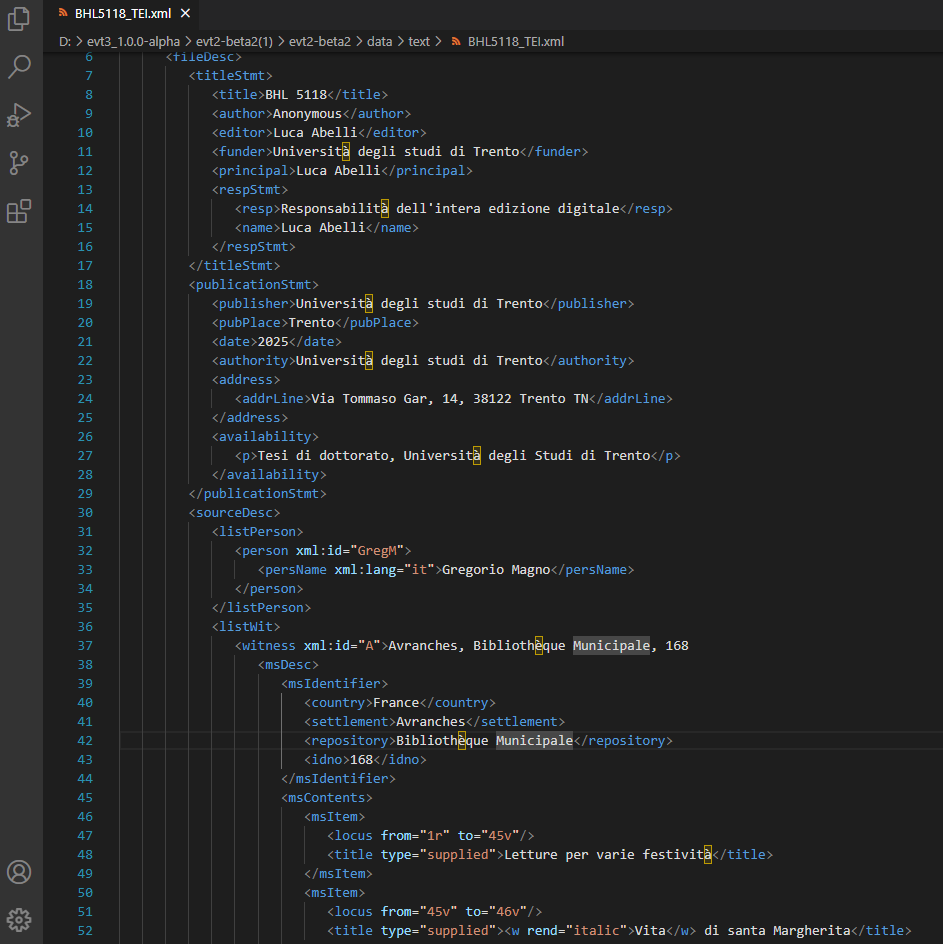 Attualmente il progetto è ancora in una fase embrionale perché alla base del lavoro digitale c’è la preparazione di edizioni critiche di tutte le parti del dossier, ancora in corso di svolgimento e sempre a rischio di non essere definitiva e accumulare ritardo nel caso vengano trovati nuovi testimoni; è stato inoltre necessario acquisire e comprendere il funzionamento di tutti gli strumenti a disposizione. Al momento attuale, mentre prosegue la preparazione delle edizioni, sta iniziando la creazione di quelle parti dei file TEI che non necessitano di avere un testo definitivo e di pari passo si sta sperimentando la resa in EVT per poi inserire le edizioni vere e proprie quando queste saranno ultimate. A questo proposito si sottolinea che gli screenshot delle schermate qui riportati si riferiscono ad un lavoro che è ancora in fase di costruzione e non definitivo, per questo possono dare un’idea dell’output finale ma non lo rappresentano.